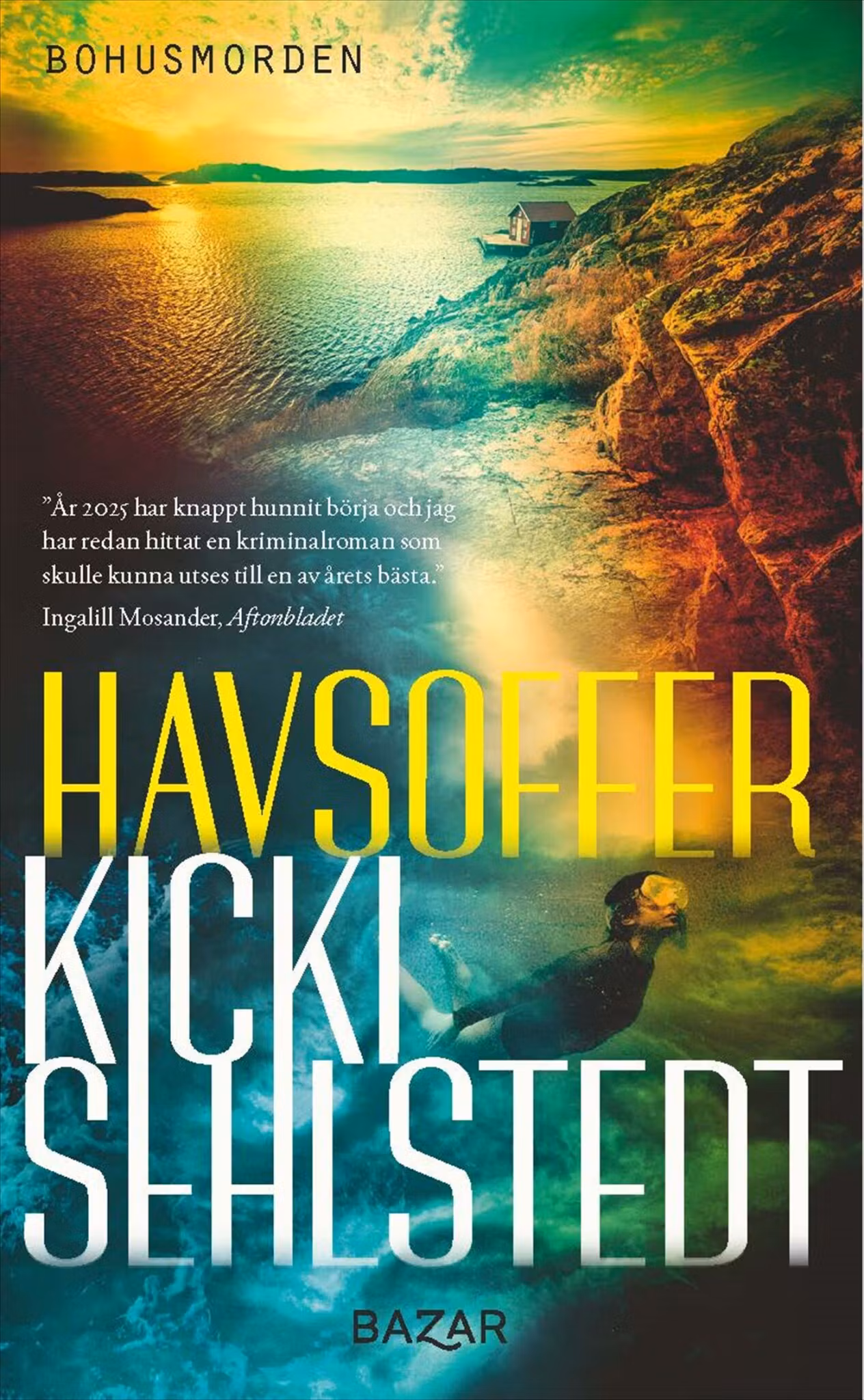 En solig septemberdag gör två dykare en makaber upptäckt: i Västerhavets salta mörker hittar de styckade kroppsdelar i en resväska.Fyndet får true crime-poddaren Julia Järvskog att återvända till Hunnebostrand där hon tillbringade barndomens somrar. Efter en uppslitande och högst offentlig separation blir det lilla samhället i Bohuslän en fristad från löpsedlarna som tapetserar Stockholm. Tillsammans med polisen Kalle Moghini startar hon en jakt på vad det egentligen var som hände midsommarafton 1994, då samhällets stora företagare försvann spårlöst. Under utredningen kommer fler hemligheter från deras gemensamma förflutna upp till ytan.Havsoffer är den första delen i Kicki Sehlstedts nya spänningsserie Bohusmorden som inspireras av verkliga, olösta brott.Kicki Sehlstedt är uppvuxen i Bohuslän, dit hon återvänder så ofta hon kan. Hon är journalist, utbildad kriminolog och författare till de hyllade kriminalromanerna i Probonoserien. Parallellt med skrivandet arbetar hon som tv-producent, bland annat för ”Svenska fall” och den Kristallen-belönade dokumentärserien ”Stockholms gängkrig. Bakom rubrikerna”. Hon skildrar brottets konsekvenser, för offer, förövare och anhöriga, i både fiktiv och dokumentär form.